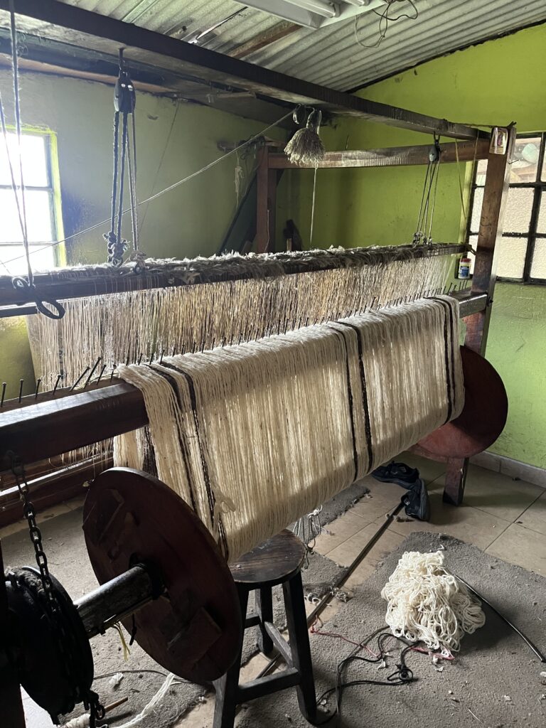 El proceso de materialización de este proyecto inicia con la confección del paño elaborado en lana de oveja criollaproveniente de Villa Pinzón, Cundinamarca. Este textil se teje en telar artesanal, siguiendo las mismas técnicas tradicionales empleadas en la elaboración de la ruana colombiana, símbolo del saber ancestral y la identidad local